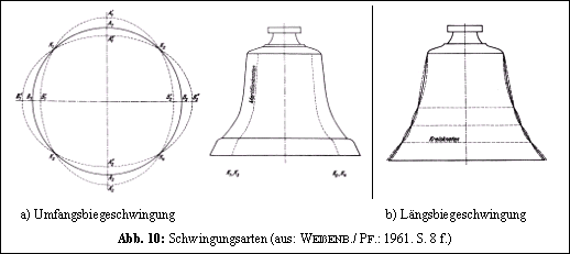 Auch eine Glocke als elastischer Körper kann beim Anschlag freie Biegeschwingungen ausführen, zum einen in Ringform (Umfangsbiegeschwingungen) und zum anderen in Gabelform (Längsbiegeschwingungen). Die Knotenlinien der Umfangsbiegeschwingungen nennt man Knotenmeridiane (m). Sie verlaufen vom unteren Glockenrand senkrecht nach oben über den Scheitelpunkt hinweg und auf der anderen Seite wieder nach unten. Vor allem in etwas älterer Literatur findet man auch die Festlegung, dass die Meridiane oben am Scheitelpunkt enden. Dadurch gelangt man eben beim Zählen zur doppelten Anzahl. Die Knotenlinien der Längsbiegeschwingungen bilden die Knotenkreise (r). (Abb. 10)