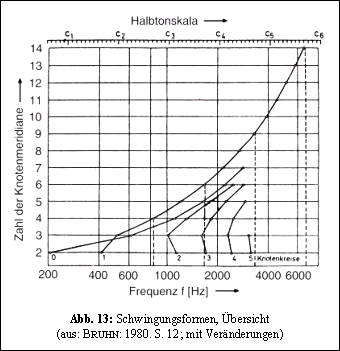 Abbildung 13 zeigt am Beispiel einer as'-Glocke die Zuordnung von Knotenkreisen, Knotenmeridianen und Schwingungsfrequenzen. Zum richtigen Verständnis der Grafik muss man beachten, dass nur an den Punkten, an denen sich die Linien der Knotenkreise mit den Linien der Meridiane schneiden, eine Schwingungsform mit ihrer Eigenfrequenz ablesbar ist.